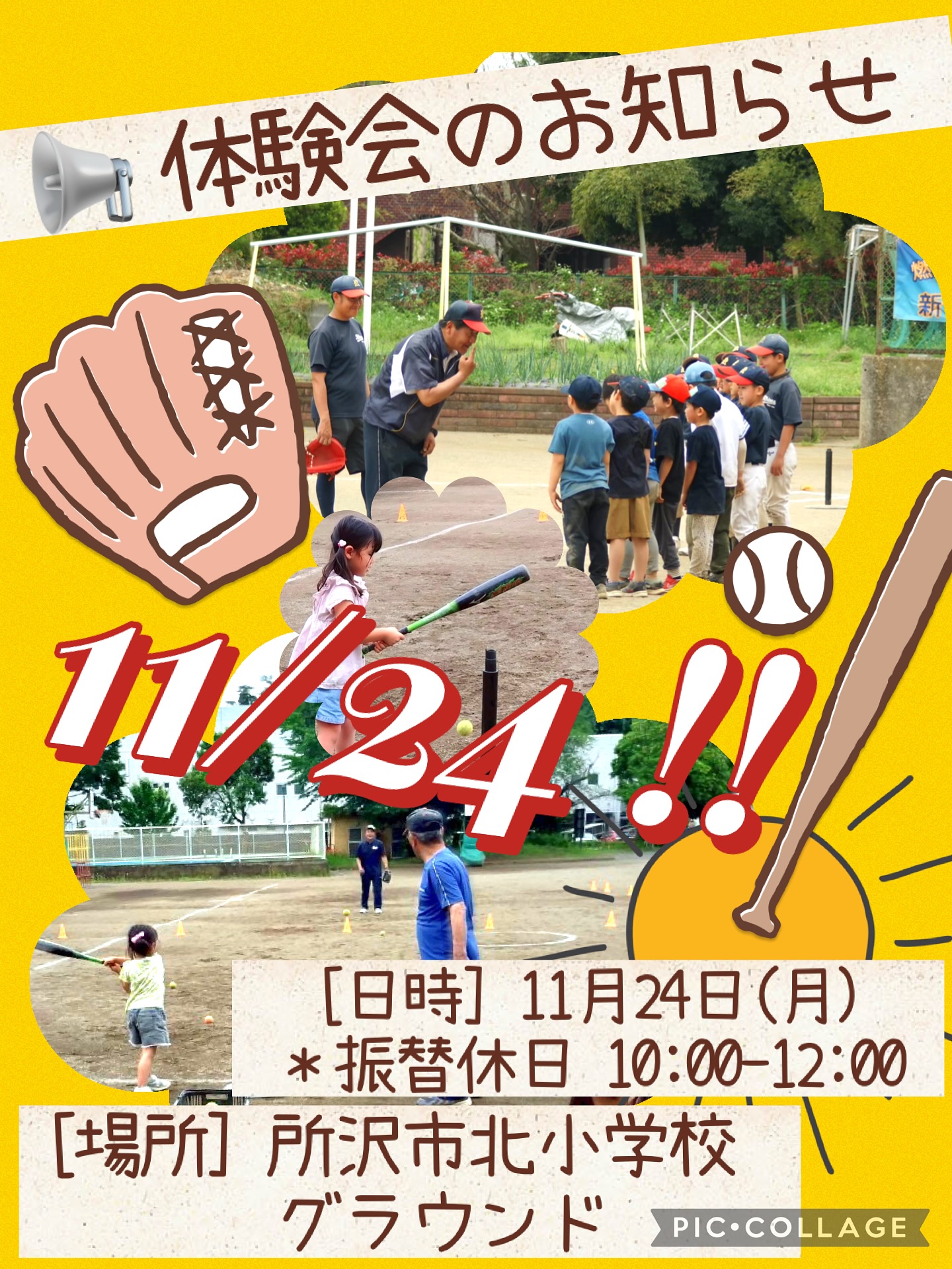 11月24日(月・祝)の10時から北小学校で野球体験会を開催します。